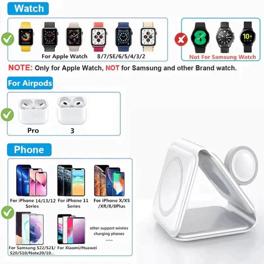 Introducing our cutting-edge 3-in-1 Wireless Charging Station, the epitome of convenience and versatility. This sleek device seamlessly charges your phone, Apple Watch, and AirPods all in one go. Compatible with Apple AirPods 3/2/AirPods Pro and Apple Watch Series 8/7/SE/6/5/4/3/2/SE, it's designed to support hybrid charging between Apple and Android devices.